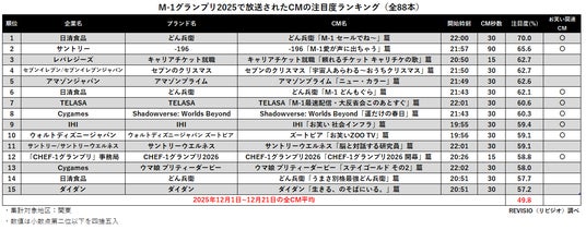 M-1ではここでしか見られないCMやお笑い要素の強いCMが多く放送されることも特徴です。1位の日清食品『どん兵衛「M-1 セールでね~」篇』は注目度70.0%という高い注目度を獲得していました。