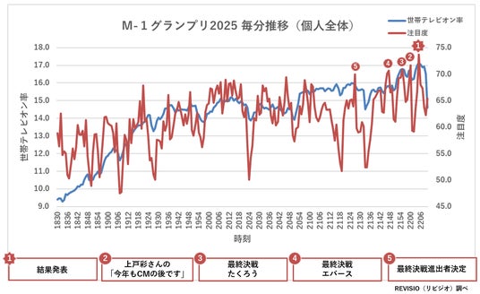 ご家庭に人体認識技術を搭載した機器を設置し、テレビスクリーンへの「アテンション(注視)」を測るREVISIO株式会社(本社:東京都千代田区、代表取締役社長 郡谷康士、以下REVISIO)は、2025年12月21日(日)にテレビ朝日系列で放送された、『M-1グランプリ2025』(以下M-1)について、どのシーンが一番視られていたのか、地上波の注目度データを使って分析致しました。(注目度が高いことは、テレビの前の視聴者がくぎづけになったことを表します)