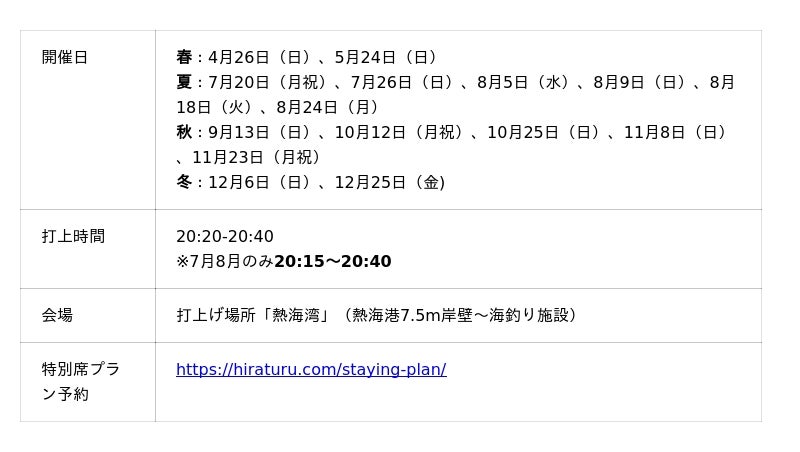 2026年熱海海上花火大会の開催日が決定。四季を彩る年間15回の花火大会では特等席確約の送迎付プラン販売中です!