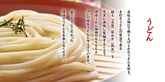 1.自社工場にて練り上げたうどん生地を手打ちうどんの製法を再現し、コシのあるうどんに!!得得うどん独特のもちもちとコシのあるうどんに仕上げ、茹でたてにこだわります。