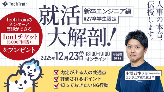 「テクノロジーを支える、全ての人のターミナルに。」を掲げるTechTrain(株式会社TechBowl 本社:東京都千代田区、代表取締役CEO:小澤 政生、以下「TechTrain」)は、2025年12月23日(火)に、27卒エンジニア志望学生のみを対象としたオンラインセミナー「就活大解剖!~新卒エンジニア編~」を開催しました。