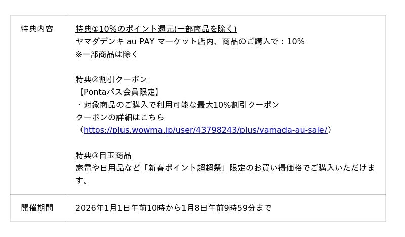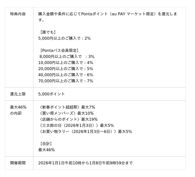 購入金額や条件に応じて最大7%のPontaポイント(au PAY マーケット限定)を還元します。「三太郎の日(2026年1月3日)」や「お買い物ラリー(2026年1月3日~6日)」の特典を組み合わせることで、最大46%のポイント還元となります。