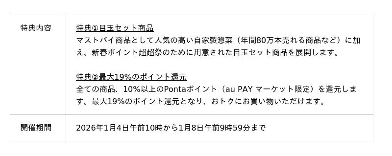 auコマース&ライフは、総合ショッピングサイト「au PAY マーケット」において、2026年1月1日午前10時から新春恒例のおトクなセール「新春ポイント超超祭」を開催します。
