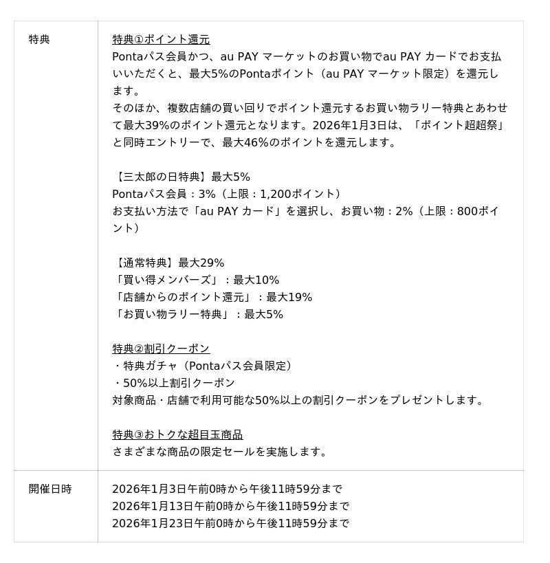年始の初売りからバレンタイン準備まで、季節のイベントに合わせた超目玉商品や福袋、最安値挑戦商品などのおトクな目玉商品や、割引クーポン、ポイント還元などの特典を提供します。複数店舗の買い回りでポイント還元する「お買い物ラリー」特典とあわせて最大39%のポイント還元となり、さらに2026年1月3日は「ポイント超超祭」と同時エントリーいただくことで、最大46%のポイントを還元します。