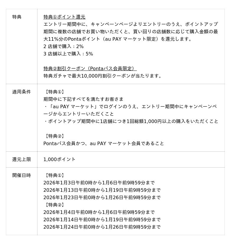 Pontaポイントを「au PAY マーケット」のお買い物限定ポイントに最大1.5倍増量できる「お得なポイント交換所」や生放送の商品紹介で視聴者と出演者が双方向にコミュニケーションできる「ライブTV」などに加え、Pontaパス会員向けの新たな特典「Pontaパス ポイントUPセレクト」でお買い物をおトクにお楽しみいただけます。「Pontaパス ポイントUPセレクト」は、Pontaパス会員なら有名ブランドをはじめとする厳選された対象商品が最大50%のPontaポイント還元となります。