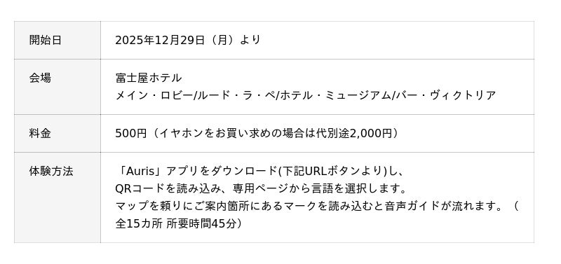 ゲストは「Auris」アプリを起動し、館内各所にあるマークを読み取ることで、場所に紐づいた音声ガイドが再生されます。初代・三代目の経営者による掛け合いと、音響演出を組み合わせたストーリーは、時を超えてホテルの歴史に触れるような没入感を生み出します。日本語・英語の2言語に対応し、国内外からお越しの皆さまにお楽しみいただけます。