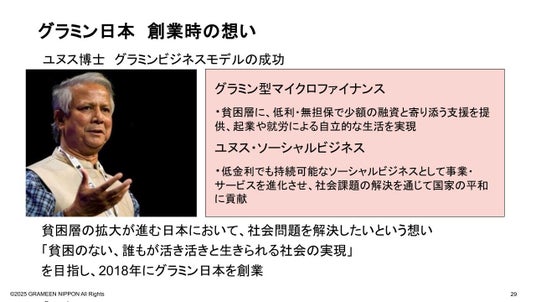 *グラミン日本は特定⾮営利金融法人という免許を取得し、貸金業を行っております。また、記載の情報は、貸金業を営む旨の表示⼜は広告を行うものではなく、かつ、貸付けに係る契約⼜は当該契約に係る保証契約の締結について勧誘を行うものではありません。