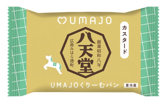 今回は、パン生地に「おウマ」の焼印を施し、「UMAJO」カラーのグリーンが印象的な限定パッケージでご用意しました。八天堂の定番のフレーバーとして人気の「カスタード」「チョコレート」の2種類をお楽しみいただけます。