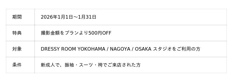 セルフ写真館 PICmiiは、カメラ専門店「カメラのキタムラ」のグループ会社として、撮影画質の仕上がりにこだわったセルフ写真館で、個室での自由な撮影をお楽しみいただけます。DRESSY ROOM YOKOHAMA/NAGOYA/OSAKAスタジオでは、1月限定で『成人おめでとう割』を実施。1/1~1/31の期間、新成人の方は振袖・スーツ・袴でご来店いただくとご利用料金より500円OFFとさせていただきます。 (記事を見た旨をお伝え下さい。)