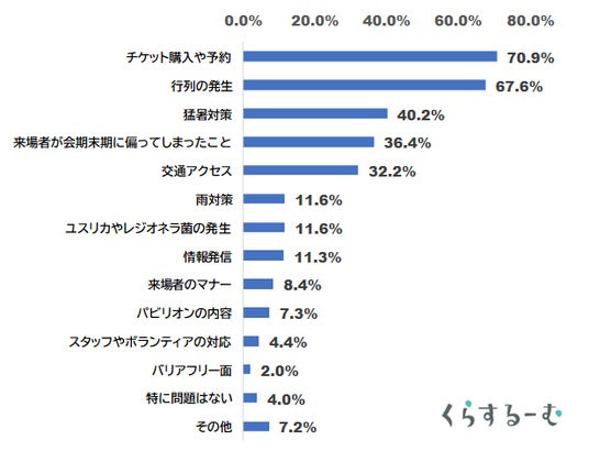 来場者が運営面で最も課題として挙げたのは、「チケット購入や予約」(70.9%)でした。次いで多かったのは、「行列の発生」(67.6%)、さらに「猛暑対策」(40.2%)や「来場者が会期末期に偏ってしまったこと」(36.4%)、「交通アクセス」(32.2%)を3割以上の方が課題として挙げています。