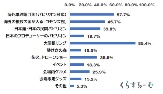 大阪・関西万博に行った方に「何が良かったか」と尋ねたところ、大屋根リング(85.4%)が突出して高い評価を得ました。パビリオンでは海外単独館(1国1パビリオン形式)が57.7%で最多となりました。