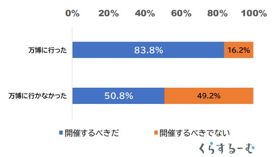 全体では「開催するべきだ」が63.5%でした。万博に行った方と行かなかった方の比較では、行った方は「開催するべき」が83.8%で、行かなかった方の50.8%と大きな差がありました。