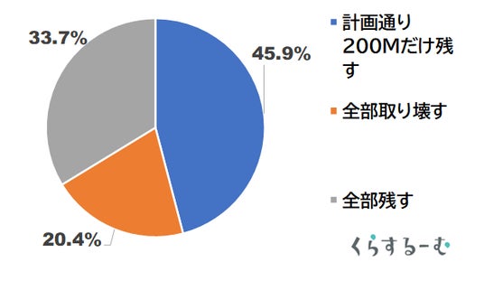 大屋根リングを今後どうするべきかとの問には「計画通り200メートルだけ残す」「全部残す」を合わせて79.6%と、8割近い方がなんらかの形での保存を望んでいました。