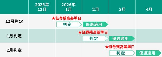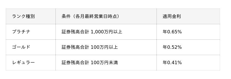 毎月の最終営業日時点の対象証券残高の合計(日本株・米国株・投資信託)を基準に翌々月のランクを決定し、優遇金利を適用します。例:2025年12月30日時点の証券残高が1,000万円以上の場合、2026年2月から「プラチナ」ランクの年0.65% (税引後 年0.517%)が適用されます。