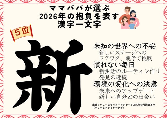子育て世帯を対象に「2026年をどんな一年にしたいか、抱負を漢字一文字で表すと?」というアンケートを実施。ランキングの結果からは、ワンオペ、仕事復帰、小1の壁といったリアルな壁に立ち向かうママ・パパたちの、切実で前向きな本音が浮き彫りになっています。内容を詳しく紹介します。