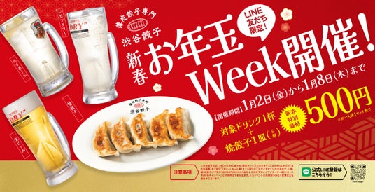 株式会社エムピーキッチンホールディングス(本社:東京都渋谷区、代表取締役:村上竹彦)傘下の株式会社エムピーキッチンが運営する『薄皮餃子専門 渋谷餃子』は、2026年1月2日(金)から1月8日(木)までの期間限定で、新春特別企画を開催いたします。期間中は「対象ドリンク1杯+焼餃子(1人前)」のセットを、税込500円という破格のプライスで提供いたします。