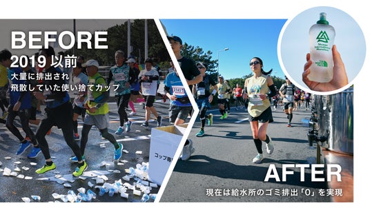 参加ランナーが各自でカップやボトルを携行することで、給水所から発生する大量の使い捨てゴミを抑制し、国内の大規模マラソン大会においても先進的な取り組みとして継続して実施しています。