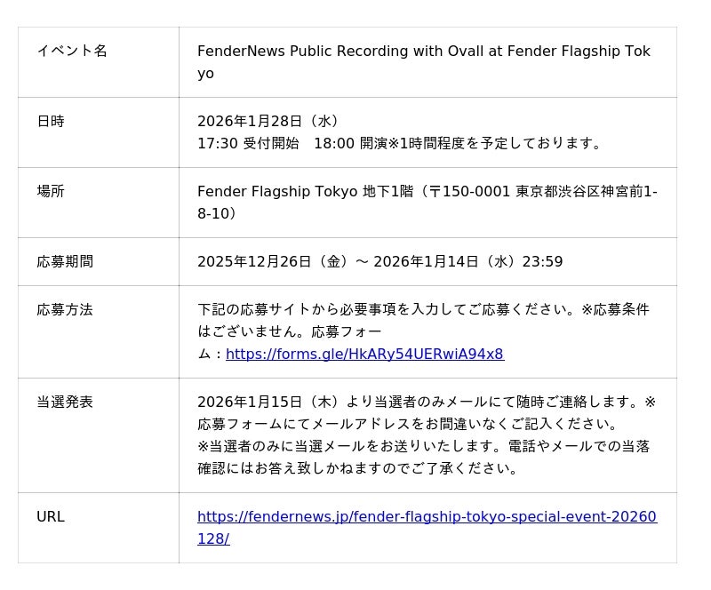 Fender Flagship Tokyoは、ソロアーティスト/ミュージシャン/プロデューサーとして活躍するShingo Suzuki、mabanua、関口シンゴによるトリオバンドOvallのストアイベント 「FenderNews Public Recording with Ovall at Fender Flagship Tokyo」 を、2026年1月28日(水) に開催します。本イベントの観覧応募の受付は、2025年12月26日(金)よりFenderNewsのイベントサイトにて開始します。