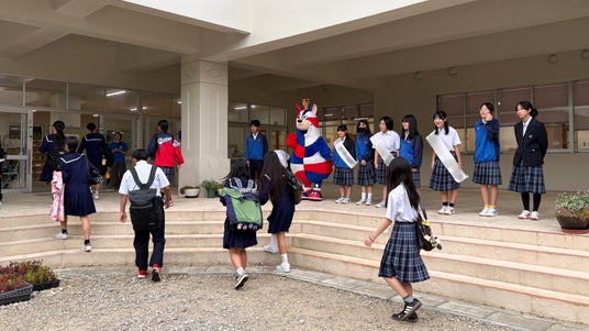 さらに、キングスのユニフォームやグッズのタオルなどを身につけて、あいさつ運動に参加してくれた学校もあり、学校全体で温かく迎えていただきました。また、北谷第二小学校でのあいさつ運動では、子どもたちからも親しまれている北谷町イメージキャラクターの「ちーたん」と一緒に参加し、より一層にぎやかなあいさつ運動となりました。
