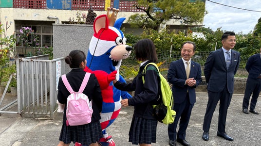 「おおきなわ」の活動の一環として実施している「ゴーディーによる朝のあいさつ運動」において、12月は名護市、北谷町、嘉手納町、南風原町の小中学校を訪問し、あいさつ運動に参加いたしました。ご協力いただいた各学校の皆さま、ありがとうございました。