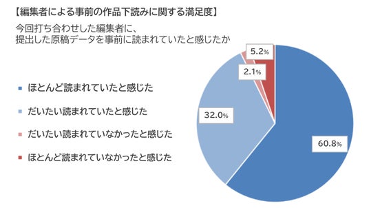 モチコミonlineでは、限られた時間の中でも、編集者がより具体的で実践的なアドバイスが行えるように、持ち込み希望者に事前の原稿データの提出をお願いしています。 「今回打ち合わせした編集者に、提出した原稿データを事前に読まれていたと感じたか教えてください」のアンケート項目では、持ち込み希望者の92.8%の方から「ほとんど読まれていたと感じた」「だいたい読まれていたと感じた」との回答で、事前に原稿を読み込んだ上での対応だったとの評価をいただきました。