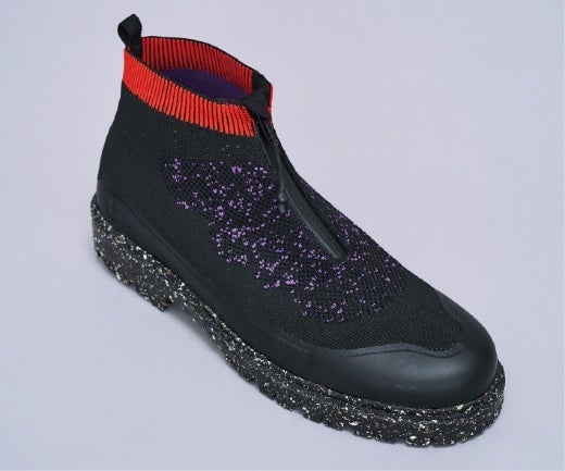 アッパーは、裁断時に無駄が出にくいニット素材、アウトソールは、植物繊維セルロースナノファイバー(CNF)を混合し、摩耗に強い自社製のアウトソール「RUBEAR(R) CNFソール」を使用しています。また、SPINGLEが得意とする、熱と圧力を用いてアッパーとソールを圧着するバルカナイズ製法で製造しています。
