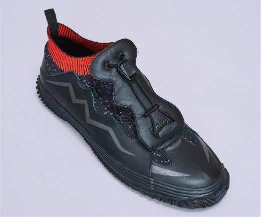 ミッドカットタイプの「SP-SAC_2045-B 」は、『攻殻機動隊SAC_2045』劇中での着用シューズ「コンバットブーツ」をモチーフにアッパー裁断時に無駄が出にくいニット素材、再生ゴムを製品の約30%含むアウトソール「VIBRAM ECOSTEP RECYCLE」を使用し構成しています。
