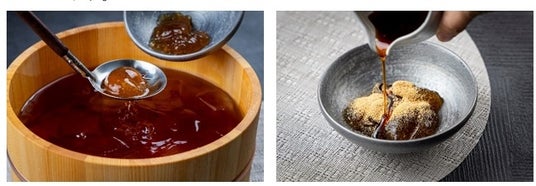 自家製わらび餅には、きな粉、黒蜜タレ、みたらしタレからお好きなものをお選びいただき、かけてお召し上がりいただきます。