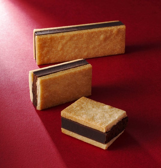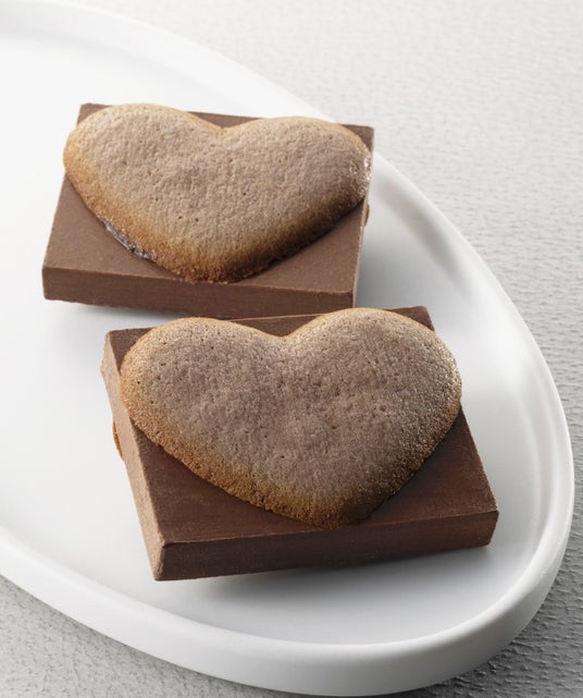 発酵バターとチョコを配合したハート型生地で、厚みのあるスクエアチョコレートをサンド。