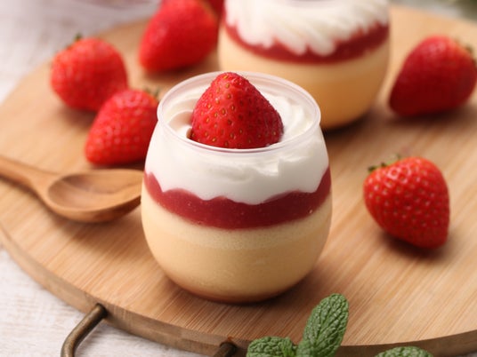 とろける口どけのなめらかプリンと、ほろ苦いカラメルソース。さらにその上に甘酸っぱいいちごソースと、濃厚な生クリームをたっぷり重ねました。仕上げに、大粒でフレッシュな「べにたま」を飾りました。