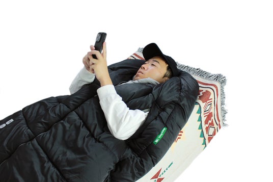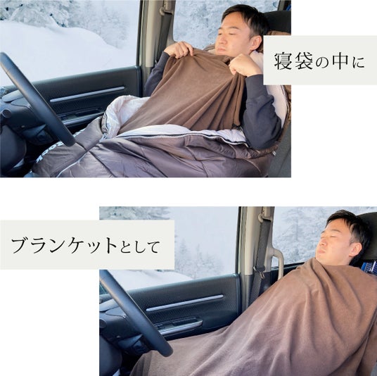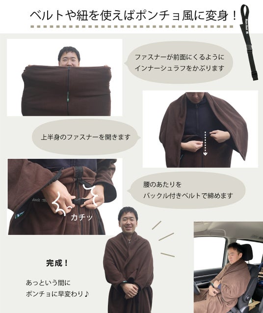 アレンジ自在!いろいろな使い方ができます寝袋に入れて毛布のように使うことはもちろんですが、バックル付きベルトを使うことでポンチョ風にアレンジすることも可能!着たまま動くことができます。