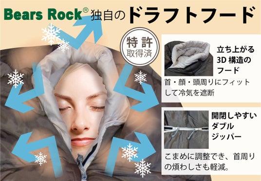 特許取得済みのドラフトフードが首・顔周りにフィットし冷気を強力に遮断。中の熱を逃しにくく、包み込まれているような感覚で寝ることができます。