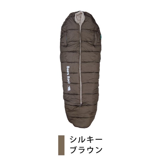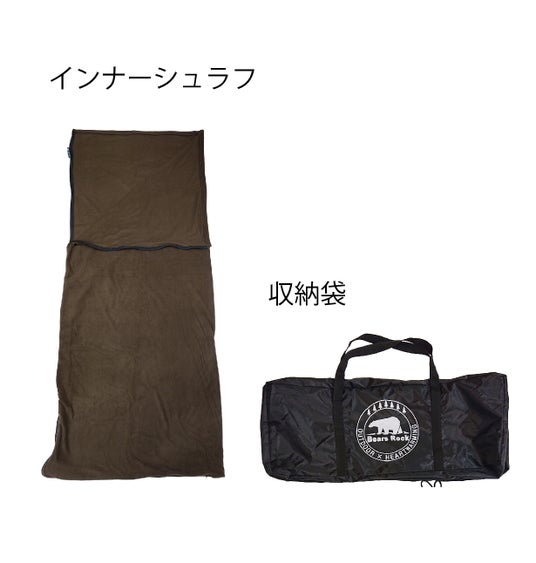 Bears Rockのロングセラー、冬用マミー型センタージッパー寝袋に、暖かいフリース素材のインナーシュラフと、さらに車中泊で役立つ用品を1つの袋に収めています。セット内容