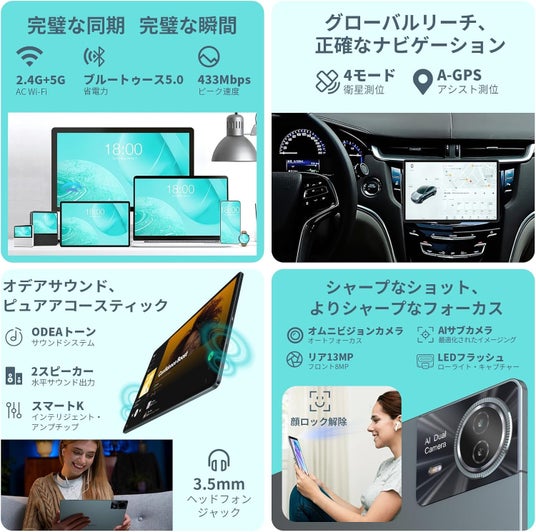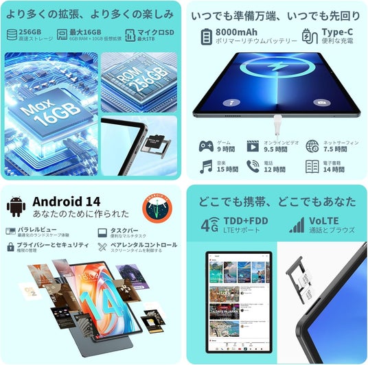 【8000mAh 大容量バッテリー + 8MP/13MP 双カメラ + 顔認証ロック】 8000mAh の大容量ポリマーバッテリーにより、動画視聴で最大 12 時間、ゲームプレイで最大 8 時間の長時間駆動が可能。Type-C ケーブル(付属)で高速充電もサポートします。