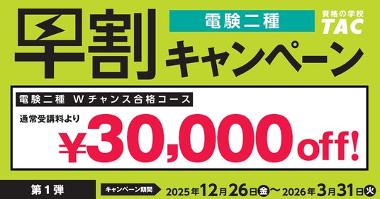 電気主任技術者講座(電験三種 / 電験二種)を展開しているTAC株式会社(東京都千代田区、代表取締役:多田敏男)は電験三種:2026年度上期&下期合格目標、電験二種:2027年度合格目標コースの販売を開始、2025年12月26日(金)より申込受付を開始いたしました。電験三種では通常受講料より最大7万円割引、電験二種では通常受講料より3万円割引となる早割キャンペーンも実施中です。