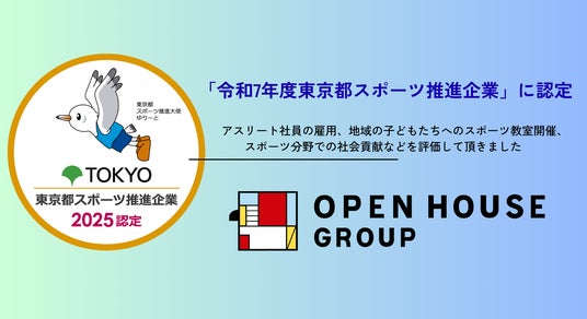 株式会社オープンハウスグループ(本社 東京都千代田区、代表取締役社長 福岡良介、以下「当社」)は、このたび東京都より、「令和7年度東京都スポーツ推進企業」に初めて認定されましたので、お知らせいたします。東京都は、従業員のスポーツ活動の促進や、スポーツ分野での社会貢献に取り組んでいる企業や団体を「東京都スポーツ推進企業」として認定し、その取り組みを周知しています。当社は、アスリート社員の雇用、地域の子どもたち対象のスポーツ教室開催、スポーツ分野での社会貢献などを対象とする「スポーツの支援部門」における取り組みを評価していただき、認定されました。
