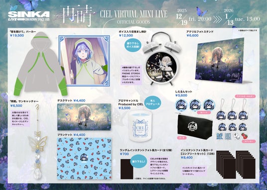 本公演のオフィシャルライブグッズの事前受注販売を実施中です。公演キービジュアルを使用したメモリアルなアクリルフォトスタンドや、楽曲をイメージしたアパレルアイテム、録り下ろしボイスを収録した目覚まし時計など、CIELの目覚め、そして再始動を象徴する特別なグッズがラインナップされています。