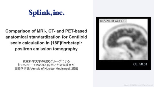 株式会社Splink(本社:東京都港区、代表取締役:青山 裕紀、以下「当社」)は、このたび、当社の脳画像解析プログラム「BRAINEER Model A」(認証番号 304ADBZX00025000) を用いた研究論文「Comparison of MRI-, CT- and PET-based anatomical standardization for Centiloid scale calculation in [18F]florbetapir positron emission tomography」が、東京科学大学(旧 東京医科歯科大学)放射線診断科の横山 幸太先生、山田 浩文先生らの研究グループによって執筆され、核医学分野の国際学術誌「Annals of Nuclear Medicine」に掲載されたことをお知らせいたします。