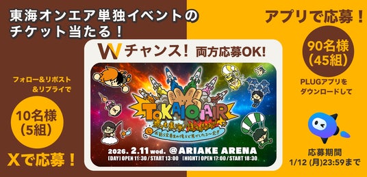 応募期間中に『PLUG』アプリをダウンロード・設定完了し、フォームからエントリーいただいた方の中から、抽選で45組90名様を2026年2月11日開催「煮ても東海!焼いてもオンエア!お前ら全員生の俺らで焦がしたろ~会!!」のリアルイベントにご招待いたします。