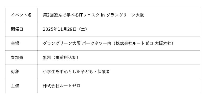株式会社ルートゼロ(本社:大阪市北区、代表取締役:柴田侑亮)は、2025年11月29日(土)、自社オフィスであるグラングリーン大阪 パークタワー内にて、子ども向けIT教育イベント「第2回 遊んで学べるITフェスタ in グラングリーン大阪」を開催しました。