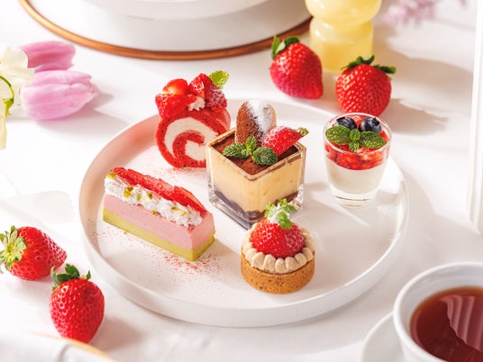 スイーツには、いちごの魅力をさまざまな表情で楽しめる5種をラインアップ。いちごと紅茶のタルト や いちごとピスタチオのムース などの新作を含む、華やかでアフタヌーンティーにぴったりのデザートが揃います。