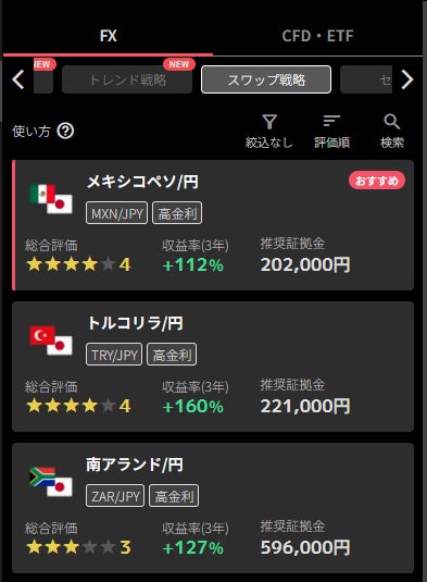 「FX自動売買 2年連続 総合満足度No.1*」のトライオートFXなら、豊富な自動売買機能で取引をサポートします。24時間、設定どおりに取引を任せることができます。選んでまかせる自動売買セレクトの「スワップ戦略」カテゴリーに、スワップ運用に特化した自動売買が実装されています。