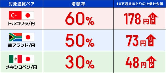 本キャンペーンでは、キャンペーン期間中にお申し込みいただいたお客様を対象に、トルコリラ/円(TRY/JPY)、南アフリカランド/円(ZAR/JPY)、メキシコペソ/円(MXN/JPY)において、基準日(2025年12月25日(金)クローズ時点)時点の保有建玉数量との差分(=増加分の買建玉)について、各営業日ごとにスワップポイントを上乗せしてキャッシュバックします。上乗せ金額は、2025年11月1日~11月30日の受取スワップポイント平均値に対して、各通貨ペアの増額率相当額(小数点二位四捨五入)です。