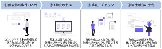 献立作成における要件(栄養基準・コスト等)を 数理最適化※1 により厳密に充足しつつ、AI 等※2により作成した献立に対する改善提案を行って補完することを目指した“ハイブリッド型アプローチ” をコンセプトとしたシステムで実証します。