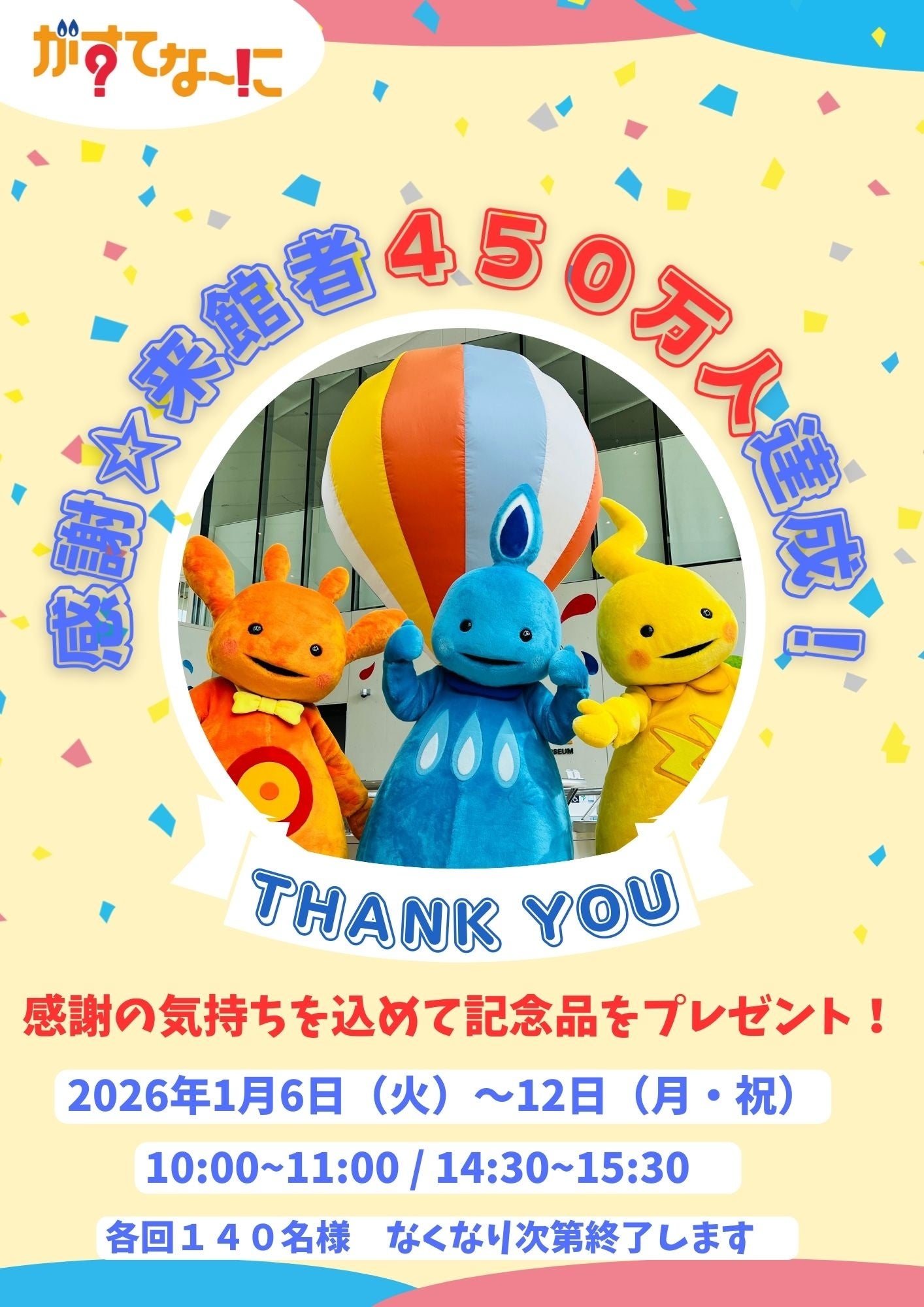 そして、この度がすてなーには、おかげさまで来館者450万人を達成いたしました。感謝の気持ちを込めて、お正月イベント期間中に記念品をプレゼントいたします。