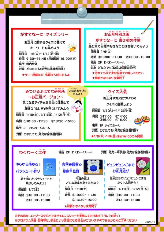 ■その他、「クイズ大会」や「サイエンスショー」、「みつける♪はてな研究所~お正月バージョン~」などお楽しみいただけます。