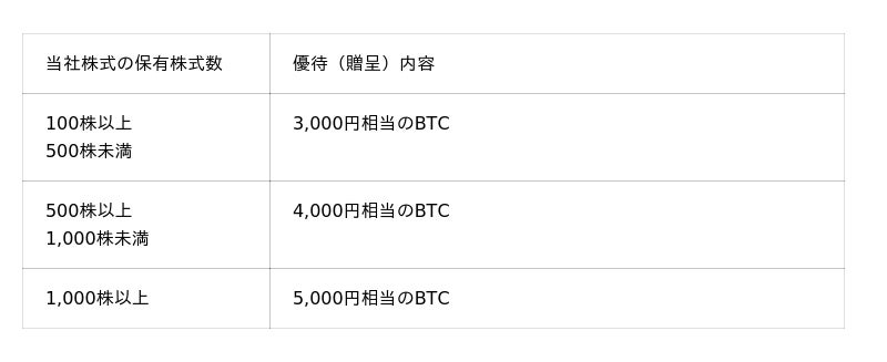 BTCを以下の当社保有株式数に応じて贈呈いたします。