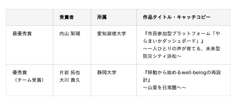 また優秀賞の片岩さん、大川さんの『山里を日常圏へ』は、移動の不便さが幸福度を下げるという分析から、既存の制度を活用したシェアモビリティの導入へと論理的に展開されており、政策提言としても非常に質の高い内容でした。