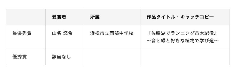中高生の部・最優秀賞の山名さんのアイディアは、『学び道』や『苗木駅伝』といった温かい言葉選びで、教育と自然、地域をつなぐ物語を見事に描いていました。