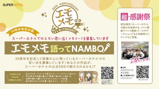 「Natural, Organic, Smart」をコンセプトに国内外で178店舗のホテル運営を手掛ける株式会社スーパーホテル(所在地:大阪府大阪市、代表取締役社長:山本健策)は、2026年1月に1号店オープンから30周年を迎えます。この大きな節目を記念し、これまで当ホテルを支えてくださったお客様お一人おひとりの心に残る宿泊エピソード(エモーショナル・メモリー)、略して「エモメモ」を2026年1月9日まで募集いたします。